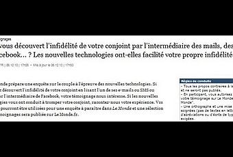 Le Monde prépare une enquête sur le couple à l'épreuve des nouvelles technologies. Si vous avez découvert l'infidélité de votre conjoint en lisant l'un de ses e-mails ou SMS ou encore par l'intermédiaire de Facebook, votre témoignage nous intéresse. Si les nouvelles technologies vous ont conduit à tromper votre conjoint, racontez-nous votre expérience. Vos réponses pourront être utilisées pour une enquête à paraître dans Le Monde et une sélection de vos témoignages sera publiée sur Le Monde.fr.