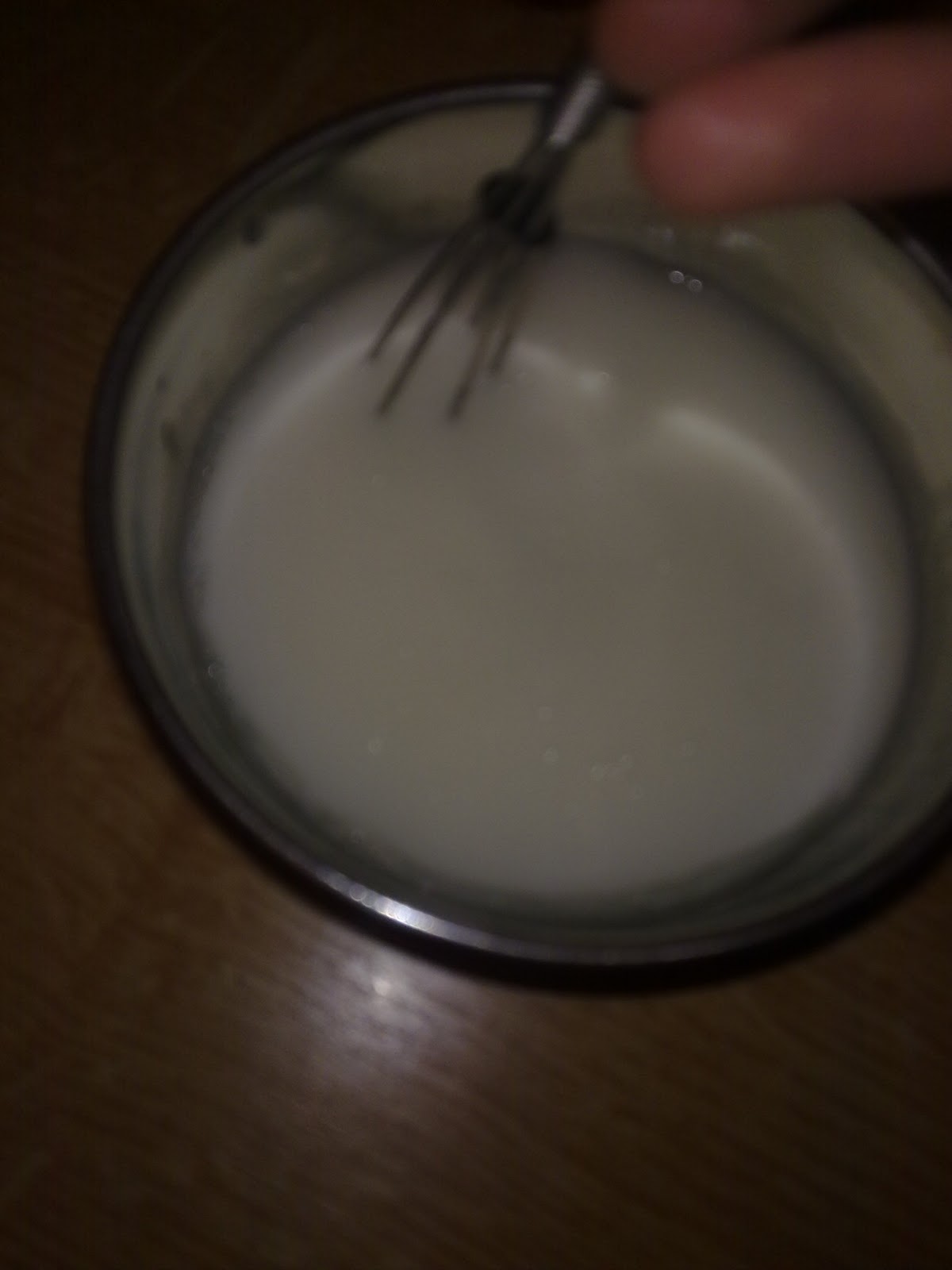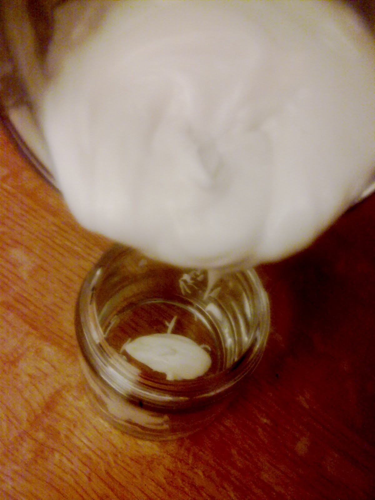 5/ Après avoir transféré ma phase aqueuse dans ma phase huileuse, je procède à l'émulsification : 3' d'agitation hors bain marie (photo de gauche), puis 3' d'agitation dans un bain d'eau froid :