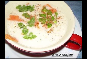 Ingrédients pour 6 personnes : 1 chou-fleur - 1 litre de bouillon de volaille - 50g de beurre - 150g de crème épaisse - 1 pincée de noix de muscade râpée - 3 tranches de saumon fumé - 6 brins de cerfeuil - sel et poivre;