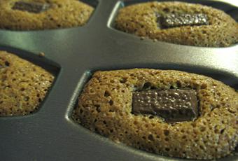 Verser la préparation dans les moules à madeleine et déposer un demi carré de chocolat au centre de chaque madeleine.