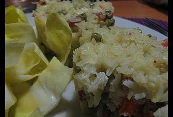Une fois cuit, égouttez le riz. Le remettre dans sa casserolle et y ajouter le lait et les lardons. Apportez ensuite les petits pois égouttés. Puis l'oeuf préalablement battu en omellette et pour finir le gruyère râpé. Salez et poivrez.