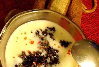 Puis montez votre velouté avec du lait et de la crème fraîche jusqu'à l'obtention d'une fluidité crémeuse émoustillante. Assaisonnez vaillamment. Puis versez dans de petits verres design (ou verrines selon le jargon contemporain), avant de mélanger avec les éclats de truffe en bocal; truffe qui parfois n'a rien perdu du sien, d'éclat.