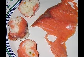 Avec le riz, former avec les mains ( trempées dans l'eau juste avant) le même nombre de boudins que le nombre de tranches de saumon fumé.