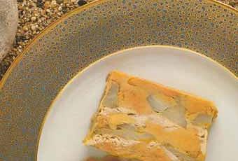 - Montez une couche de foie gras, puis une couche de lamelles de volaille marinées, une couche de foie gras, puis une couche de lamelles d’artichauts après avoir enlevez le foin; refaites le même montage et finissez par du foie gras. Faites cuire à four doux (100°), pendant 20 minutes. Laissez reposer au frais au moins 24 heures.