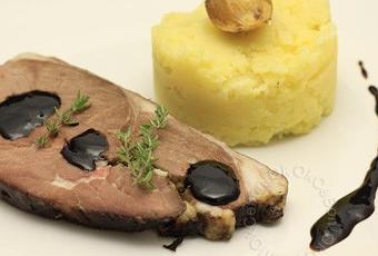 Servir en tranche nappé de sauce et accompagné d'un écrasé de pommes de terre.