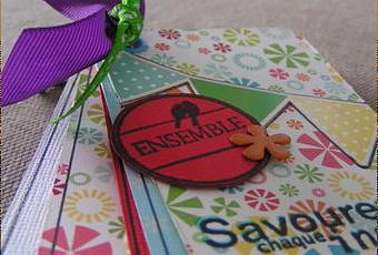 Encore un peu de scrap avec ce cadeau fait par ma copine Delphine, lors d'une soirée scrap improvisée à la maison. Admirez le résultat de ce mini réalisé avec très peu de matériel : quelques chutes de papier, tampons, oeillets et le tour est joué!