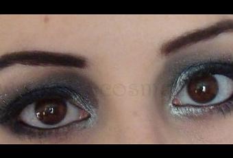 Voici un maquillage tout à fait adapté aux fêtes de fin d’années, dans les tons argentés/noirs, et un chouilla « dramatique » de part la forme (fard gris très monté en interne) et grâce à l’ajout de faux cils. Les lèvres sont brillantes mais assez claires, légères, afin de ne pas trop charger le visage. J’ai osé à nouveau la star powder en highlighter, après tout, les fêtes sont le moment où jamais pour mettre des paillettes ou de jolis reflets irisés. Les photos ne reflètent malheureusement pas la réalité…on dirait ici que c’est mal estompé/mal monté ou plus intense d’un côté que de l’autre alors que non pourtant…