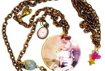 Collier "Memories" composé d'une breloque en nacre imprimée d'une fillette vintage, de breloques à motifs, d'une breloque ballerines dorée, d'une breloque mini peigne doré et de perles diverses en verre. Chaîne en laiton bronze. Longueur totale une fois porté: 45 cm.