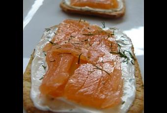 Puis sur chaque toast, posez un morceau de saumon fumé. Parsemez d’aneth pour la déco et servez bien frais !