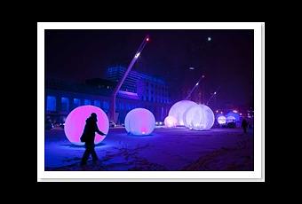 Je me retrouve à la Place des Festivals du Quartier des spectacles de Montréal, près de l’Esplanade de la Place des Arts. C’est le lancement officiel Sphères polaires. 25 immenses sphères en vinyle illuminés de l’intérieur interagissent avec les touristes et les passants. Une exposition gratuite qui aura lieu du 15 décembre au 27 février 2011.