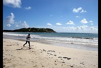 Les plages et les savanes s'enchaînent, dévoilant de très beaux paysages côtiers. Les falaises sont parfois découpées comme en Bretagne, ailleurs c'est plutôt la carte postale d'un paradis avec cocotiers qui s'impose. Je rejoins bientôt Marius et nous restons ensemble jusqu'à l'ultime ravitaillement où je ne veux pas trop m'arrêter. Je profite encore un peu du paysage et me traîne ainsi jusqu'à la ligne d'arrivée. Je pense que j'ai vécu là une de mes plus difficiles journée de course pour arriver simplement au bout d'une épreuve, sans bien sûr penser du tout à faire une quelquonque performance. Sans doute la fatigue de l'Himal race y est elle pour quelque chose, mais je pense surtout que le climat m'a joué un bon tour. Enfin ce n'est pas bien grave, j'ai tout de même traversé la Martinique ce qui restait le but du jeu!