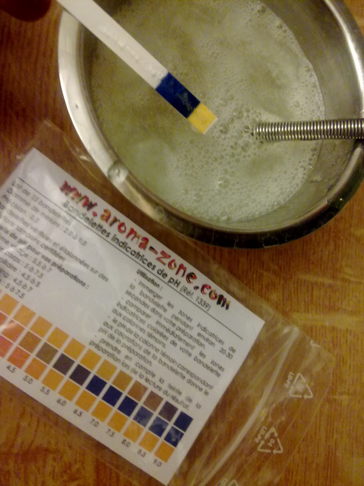 6/ A priori mon shampoing est terminé. Seulement pour les soins pour les cheveux, un pH acide est nécessaire (entre 4,5 et 7). Je teste donc mon shampoing à l'aide d'une bande pH. Le pH est basique, je vais donc rajouter un bon mililitre d'acide lactique pour diminuer le pH et obtenir un pH acide, préférable pour les cheveux.