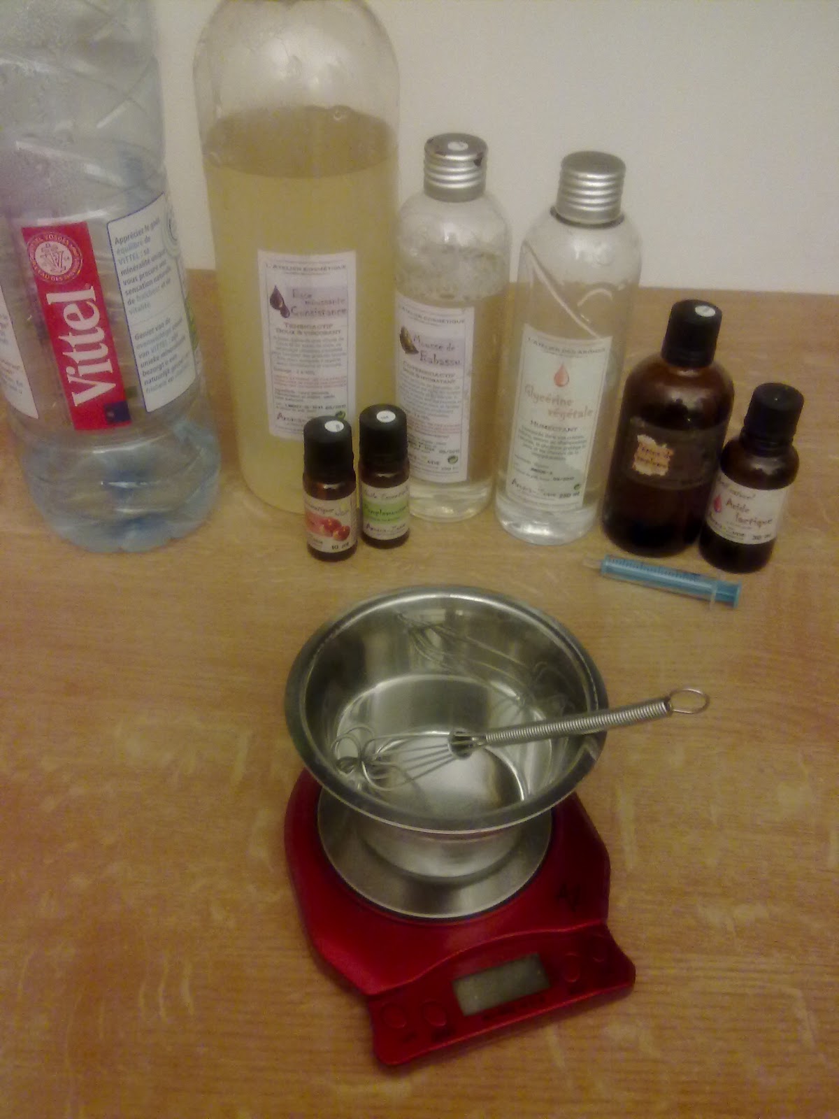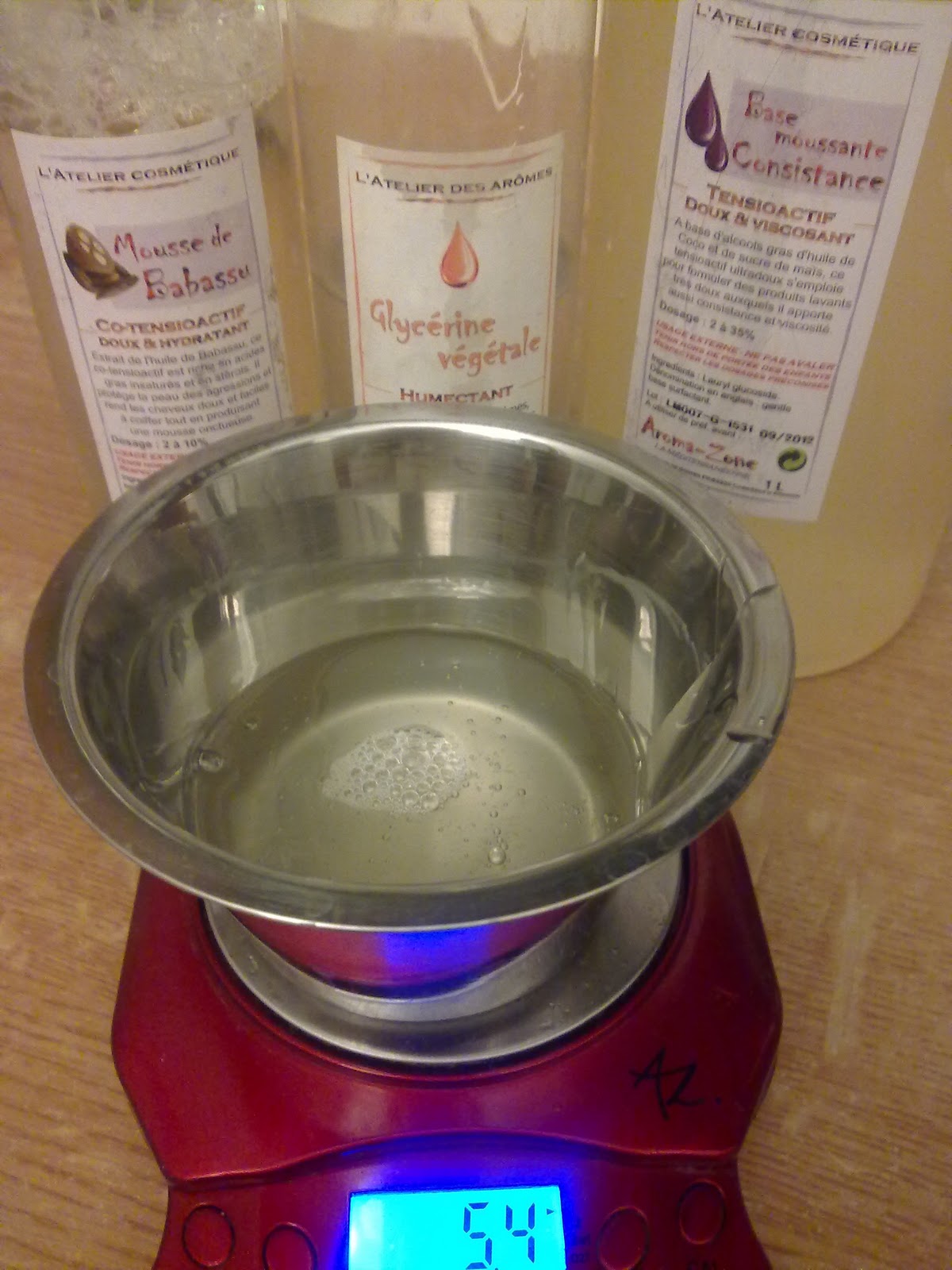 2/ Préparation de ma phase tensioactifs : je transvase une à une les quantités de tensioactifs dont j'ai besoin puis j'agite bien :