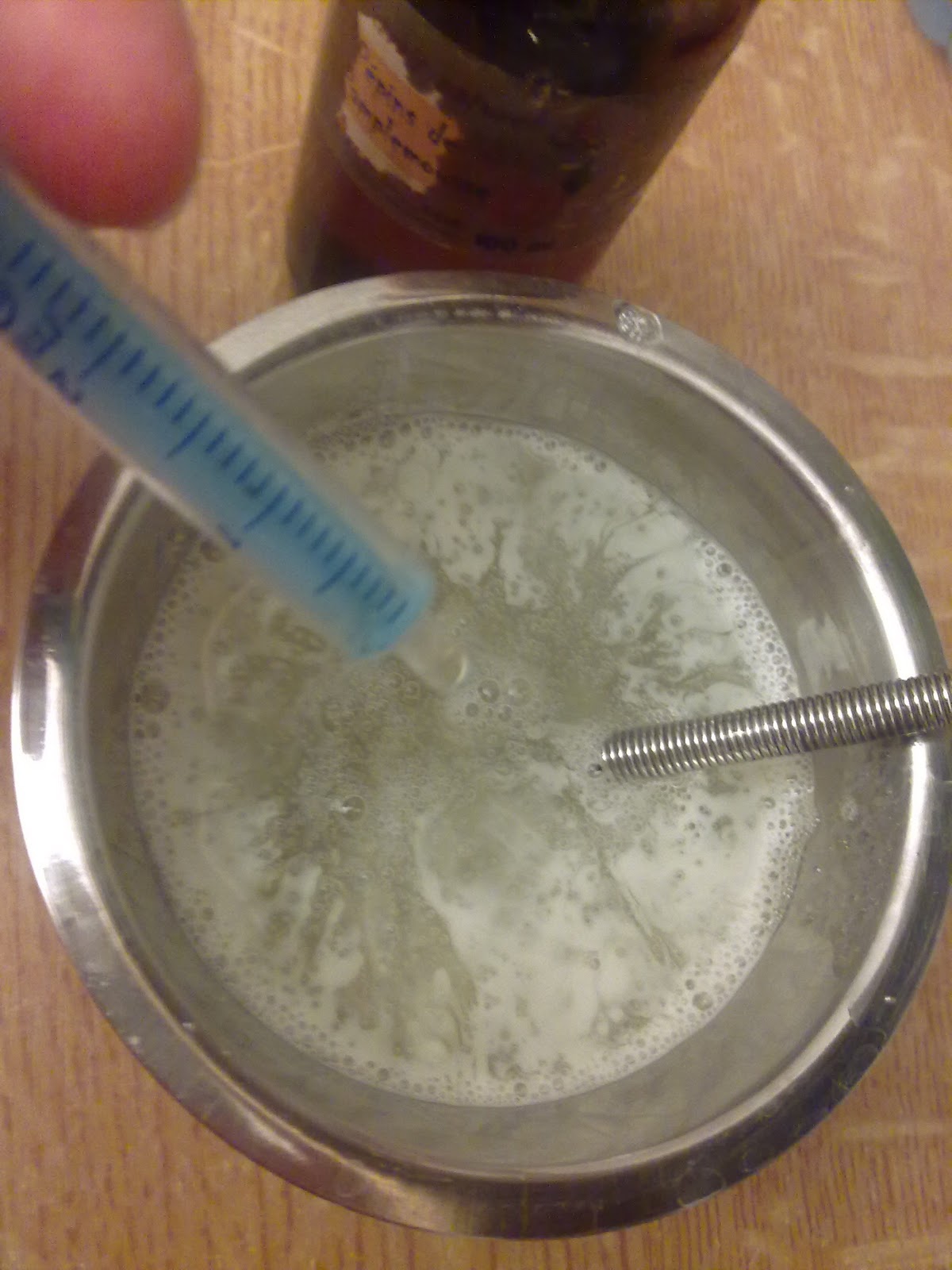 4/ Maintenant que ma base lavante est prête, j'ajoute un à un les derniers ingrédients en mélangeant bien entre chaque ajout ; ici j'ajoute l'extrait aromatique et l'huile essentielle. Enfin je mélange bien au mini fouet.