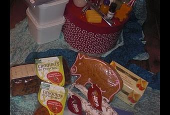 chorizo, saucisses sèches , pain d épice au miel/caramel, un cochon pain d épice ,du chocolat ,du thé, des croquettes de Provence miammmm !!