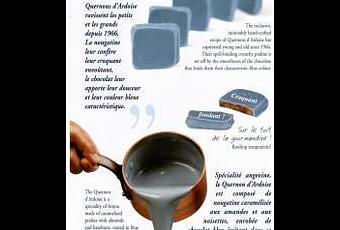 Spécialité Angevine le Quernon d ' ardoise est composé de nougatine caramélisée aux amandes et aux noisettes,enrobé de chocolat bleu imitant dans sa forme et sa couleur les ardoises qui couvrent les maisons de la ville d ' Angers et dont l' extraction s' effectuais à ses portes à Trelazé et un peu plus loin a Segré.