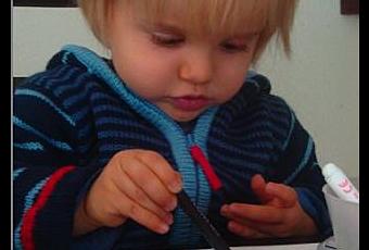 Depuis quelques semaines Petit Loulou veut et aime dessiner. Depuis que nous l'avons installé à côté de nous (Petit Choux et moi) lors d'un après midi peinture avec une feuille, des craies et feutres en tout genre il réclame cette activité. C'est donc souvent que dans la journée, plusieurs fois par jour même, il se dirige vers le pot à crayons, me les montre ainsi que son réhausseur. Les choses sont claires il souhaite que je l'installe pour dessiner. Alors oui le mot est fort parce qu'il ne fait que tracer des traits de couleur mais j'aime le voir essayer les différents crayons et feutres, il les prend en main, les regarde attentivement et puis les applique sur la feuille... Rien de bien transcendant me direz vous mais j'adore ces moments là. Je m'installe alors à ses côtés, bien souvent en face de l'ordi, j'en profite pour répondre à mes mails ou vos commentaires et l'admire. Soyons clairs c'est le mot, je le scrute avec mon petit sourire aux lèvres, fière de ce petit bonhomme qui grandit et aime se poser pour faire des choses.