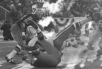 1 ) The Ice Bowl : Impossible d’aller ailleurs pour le premier choix, le légendaire Ice Bowl qui a traversé le temps et qui est encore dans les mémoires de tous. C’est le match le plus froid à n’avoir jamais été disputé dans la NFL en termes de température (Le Freezer Bowl au # 3 était plus froid, mais c’est en incorporant le facteur vent). En plus du froid, quand même -25 degrés avec des pointes allant jusqu’à -44, c’est aussi la rivalité entre les 2 équipes qui s’étaient affrontées l’année précédente en finale de la NFL (l’équivalent aujourd’hui du championnat de la NFC) qui éleva l’affrontement au statut de légende. Green Bay a finalement battu Dallas 21-17 suite à une mémorable poussée offensive menée par Bart Starr dans les 5 dernières minutes de la partie. Peut être le plus grand match de l’histoire de la NFL, mais certainement le plus mémorable dans lequel la météo fut un facteur.