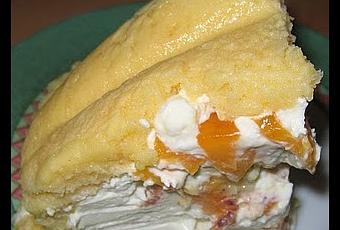 Garnir le moule en alternant une couche de préparation au fromage blanc, une couche de pêches et une couche de biscuits trempés dans le jus d'orange.