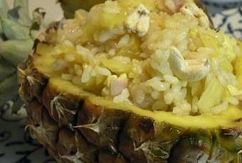 Décalotter l'ananas et le creuser. Couper la pulpe en petits dés et conserver le jus. Cuire l'oeuf brouillé et le mélanger dans un saladier avec le jambon en dés, le riz froid, et les morceaux d'ananas. rectifier l'assaisonnement avec le soja, le sel et le glutamate. Servir le riz dans l'ananas, saupoudré de flocons de porc frit et de ciboule chinoise émincée. Passer au four pour le manger chaud, ou déguster froid (les deux sont très bons).