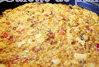Mélanger tous les ingrédients : oeufs battus, pain au lait basilic, les tomates et les cubes de fromage.