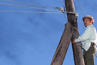 Mais là où Le Voleur de lumière est le plus réussi, c’est dans la peinture d’un mode de vie aimé mais mis à mal et menacé, dans lequel les relations humaines ne sont ni parfaites ni faciles, dénuées ni de frustrations ni de brutalité, mais sont pourtant directes et dégagées de la médiation de l’argent, de la fourberie. Au sein du film, c’est la figure caractéristique de M. Lumière, grimpant aux poteaux avec ses crochets aux pieds et retenu par une ceinture bricolée, qui orchestre tous ces liens. Son vol de lumière est-il un acte politique, en faveur d’une « polis » où entraide et sympathie auraient leur place ? Sa femme, pour plaisanter, l’appelle une fois « mon révolutionnaire » ; mais c’est une ébauche d’action politique, à peine vécue comme telle. Acte fait par bonté par un homme naïf et crédule, qui se fait presque berner par ceux auxquels il s’oppose. Son rêve, généreux, de construire un ensemble d’éoliennes près du village pour fournir de l’électricité à bas prix à tous les habitants, semble ne pouvoir être mis à exécution qu’à condition d’être récupéré comme projet lucratif, indifférent aux villageois.
