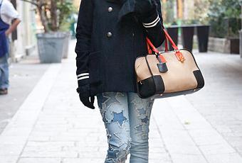 Le sac de Karin est un Amazona, un des sacs mythiques de la marque. Boston assez classique, il se décline ici dans une variation de suède beige garni de poignées en verni orange. Un mix assez osé qui marche plutôt bien !