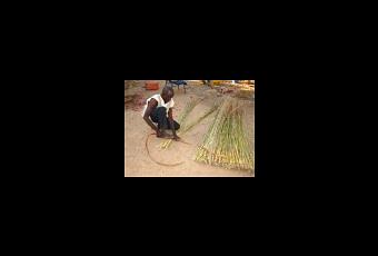 - brin par brin, on dispose en quinconce les herbes mises à plat sur le sol, en les liant avec des lanières d'écorce préalablement trempées dans l'eau pour les assouplir