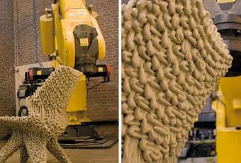 Ici le recyclage s’effectue au niveau des moyens de fabrications, une veille machine industrielle vétuste (ici en jaune), reprogrammée, lui donnant maintenant un nouvel avenir. Au départ du plastique, sous forme de grains, colorés ou on, passant par la machine qui va les fondre pour et en faire une longue “ficelle” qu’elle superpose par des mouvements précis.