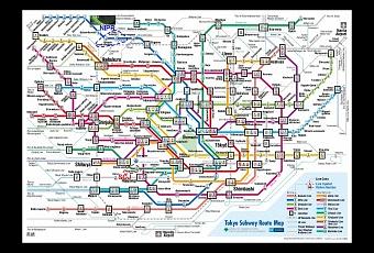 La carte ci-dessous représente les lignes des trains et métros de Tokyo. Les deux plus grandes gares sont celle de Tokyo et de Shinjuku. L’aéroport de Narita est indiqué en haut à droite et celui de Haneda en bas.