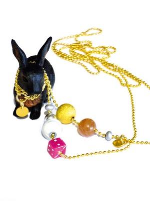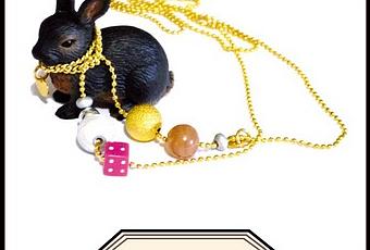 Collier "Raby, le lapin chic" composé d'une figurine animale (4 x 4 cm) de perles et breloques diverses. Attention, le collier que vous recevrez aura une chaîne couleur cuivrée, contrairement à celui de l'image. Chaîne cuivrée à billes fines. Longeur totale uen fois porté: 43 cm