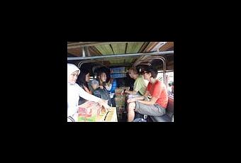 Apres avoir rejoint Anne et Christophe a l aeroport de Jakarta, nous nous sommes directement envoles vers Benjamarsin a Borneo. L indonesie est si vaste que choisir sa destination parmis les multiples iles n est pas chose aisee. Borneo n est pas touristique et cela rend les choses difficile pour les transports et pour trouver quelqu un parlant anglais, pourtant les hotels sont toujours pleins ( de touristes locaux) et reserver par telephone en ne parlant pas indonesien est impossible.