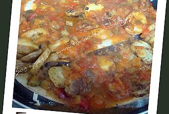 Una recetita de pescado muy rapida... mi marido habia comprado trozos de pez espada y no sabia como cocinarlo... si me encanta el pescado tengo un poquito de pena a cocinarlo, sobre todo el pescado del Mediterraneo, que no conozco bien... soy una chica del Mar del Norte y más acostumbrada con el bacalao o los lenguados... Nos ha encantado esta receta porque el pescado no es seco y la ventaja es que es un plato unico y completo.