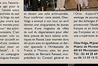 Il y a exactement dix ans commençait pour moi une aventure inoubliable : celle de mon voyage en Russie pour préparer une coopération culturelle entre des enfants de la région Creilloise et des enfants de la Volga du sud . Sollicité par des professeurs russes de français afin de mettre en scène l'opéra pour enfants qu'il avait composé, Dominique Grébert, directeur de l'école de musique de Montataire, me demanda de l'aider et de l'accompagner pour monter ce projet. Pendant deux ans nous avons réussi en créant l'association OISE-VOLGA à trouver les fonds et à emmener les enfants français là bas et les jeunes russes ici avec l'appui des parents et de différentes autorités dont le Ministère français des affaires étrangères, l'alliance Française et la Chambre de commerce et d'Industrie de Saratov . A Creil, le spectacle fut présenté devant une salle comble à la Faïencerie. Il fut produit en Russie, à Saratov, Samara et Moscou. Cette formidable aventure me permit d'aller cinq fois en Russie, d'y découvrir des gens extraordinaires et d'agir également pour le rapprochement de la chambre de commerce de Saratov avec celle de l'Oise. J'ai écrit mes notes du premier voyage dans un recueil intitulé le "Kiosque russe" que vous pouvez lire en cliquant ici LE KIOSQUE RUSSE