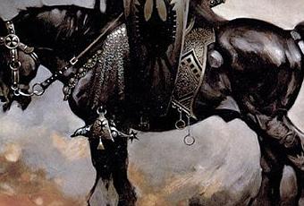 "La terre s’ébranla. Le tonnerre résonna. À nouveau, des pierres se détachèrent du plafond et traversèrent l’autel. Gath tomba à genoux. La roche lui brûla les paumes. Dans la bouche grande ouverte, l’écran de flammes avait repris sa place. Le heaume était inaccessible, objet à peine visible derrière un mur rouge et crépitant. Le barbare se jeta en avant et plongea les mains dans le feu en poussant un grondement. Triomphant, il extirpa le trésor de métal de sa prison de flammes."