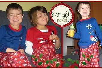 Cette année, je me suis prise un peu en retard et j'ai poussé la chose encore plus loin, Papabooh! Et moi-même étions pour avoir notre tenue festive! Je suis allée dans un grand magasin et j'ai trouvé, dans la section des filles, deux pyjamas dont un que j'ai trafiqué un peu en enlevant 2 boucles. Chut! C'est mon secret, Fiston ne doit pas le savoir! Pour les grands, c'est chez les papas que je suis allée et j'ai pris une chemise de nuit pour moi et le pantalon assorti pour mon homme.Alors là, aujourd'hui, on est prêt pour commencer nos vacances de Noël!Notre congé qu'on souhaite relaxe...