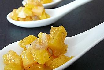 Pour le Réveillon de Noël, à l'apéritif, j'avais préparé une cuillère light, fruitée et exotique. Comme toutes les présentations en cuillère, cette préparation peut être présentée en verrine. Cette recette peut se préparer à l'avance