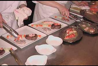 Chauffer un peu de coulis de homard rectifier l’assaisonnement et napper sur la viande et sur le homard.