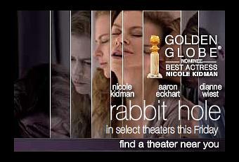 Avec The Rabbit Hole, le réalisateur au visage encore poupon, plonge le spectateur dans un drame où des parents perdent leur unique enfant à cause d'un chauffard, alors que ce dernier tente d'entrer en contact avec eux. Avec ce film, Mitchell offre à Nicole Kidman le rôle de sa vie, si l'on en croit les quelques vidéos disponibles sur le net, où elle est magistrale.. Un Oscar? On le saura en février prochain, mais en tout cas, d'après la presse et les critics Us....Kiddie serait sur la bonne voie....Mais attention quand même à Lesley Manville (Another year) ....Avec encore Sandra Oh et Aaron Eckart