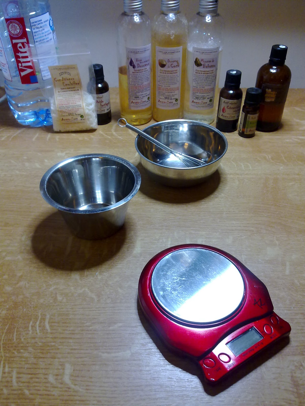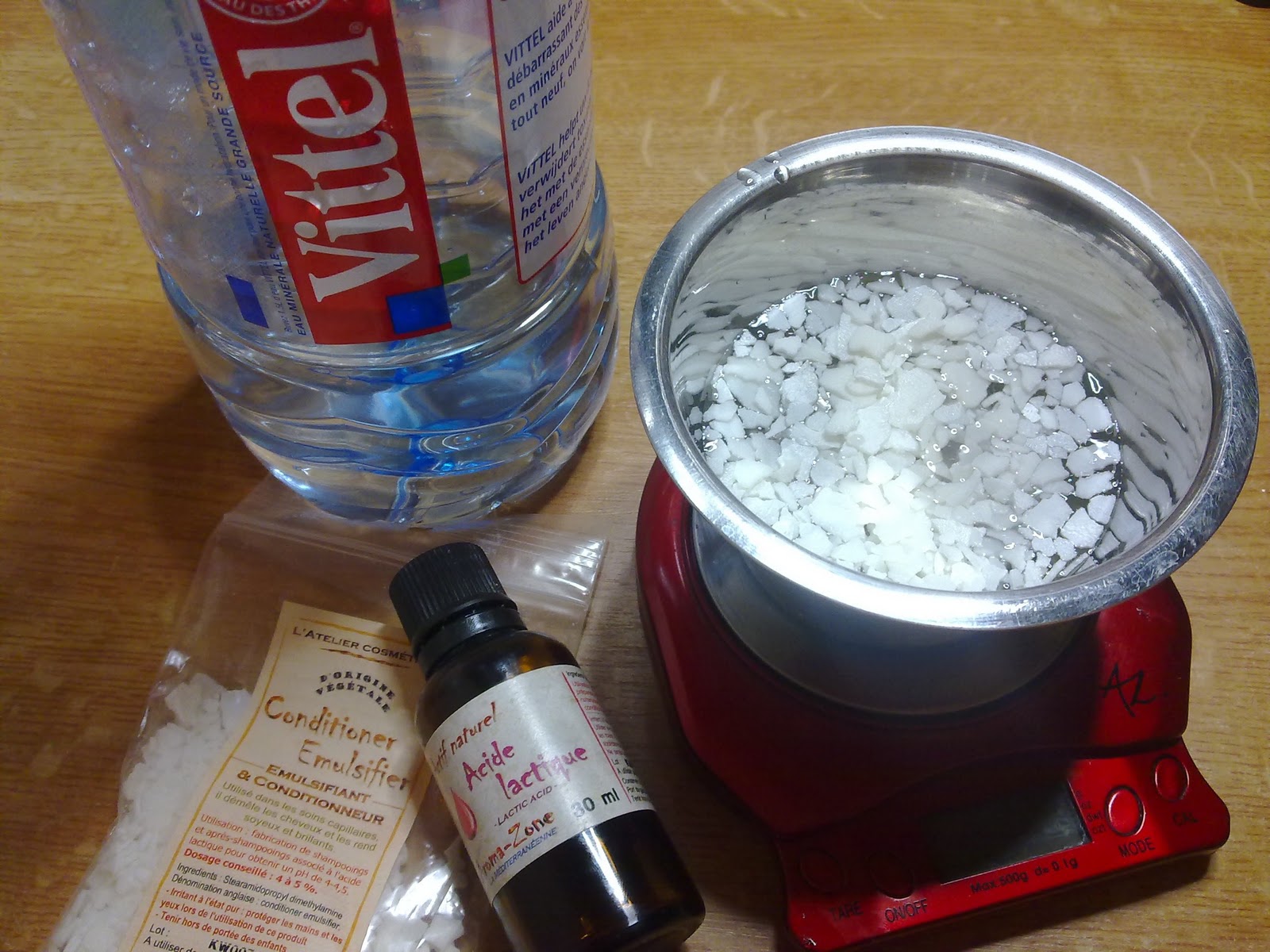 - 2.5% soit 3g d'Acide lactique -je n'ai pu en mettre que la moitié, j'en ai plus- (pour acidifier le pH et activer le conditioner emulsifier)