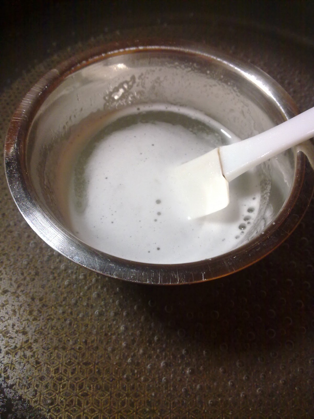 4/ A présent je mets ma phase [Eau minérale + Conditioner Emulsifier+Acide lactique] au bain marie afin de faire fondre le Conditioner Emulsifier : (photo prise en fin de bain marie)