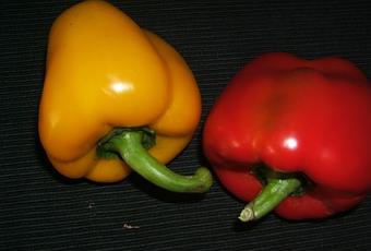 voici nos poivrons. J'en entends déjà crier : beurk, je digère pas les poivrons, c'est infecte. Et bien non, sachez que c'est la peau qui est indigeste, donc nous allons l'enlever et ce goût si caractéristique que vous n'aimez pas disparaîtra.