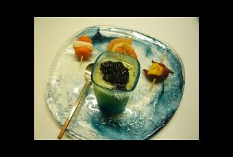 - Quelques amuse-bouche (crevette au curry et pamplemousse, magret fumé et mangue pimentée, poulet et carotte vanillés, velouté de concombre aux oeufs de hareng fumés) : joli et varié,