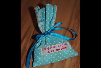 Le petit sac qui recueille les dragées est fait main. Vous pouvez choisir soit 2 motifs de tissus différents ou encore 2 types de tissus différents. Le tissus de devant peut également être ajouré pour apercevoir les dragées (du tulle, de la dentelle, de l’organza…)