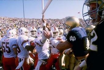 7 ) The Catholics vs The Convicts : Dans toute la glorieuse histoire de la très catholique université Notre Dame, cette partie fut votée haut la main comme la meilleure à n’avoir jamais été disputée au stade de South Bend. Octobre 1988, deux équipes invaincues : les Hurricanes de Miami classés premiers au pays contre les Fighting Irish de Notre Dame. Les attentes étaient élevées et les 2 équipes n’ont pas déçu, se livrant un match d’anthologie. Miami marqua en fin de match pour rétrécir le score à 31-30 en faveur de Notre Dame, mais plutôt que d’y aller pour l’extra-point et l’égalité, l’entraîneur des Hurricanes Jimmie Johnson décida d’y aller pour la victoire en tentant le converti de 2 points. Les Canes ont échoué, laissant du même coup la victoire aux Irish qui allèrent remporter le championnat national par la suite.