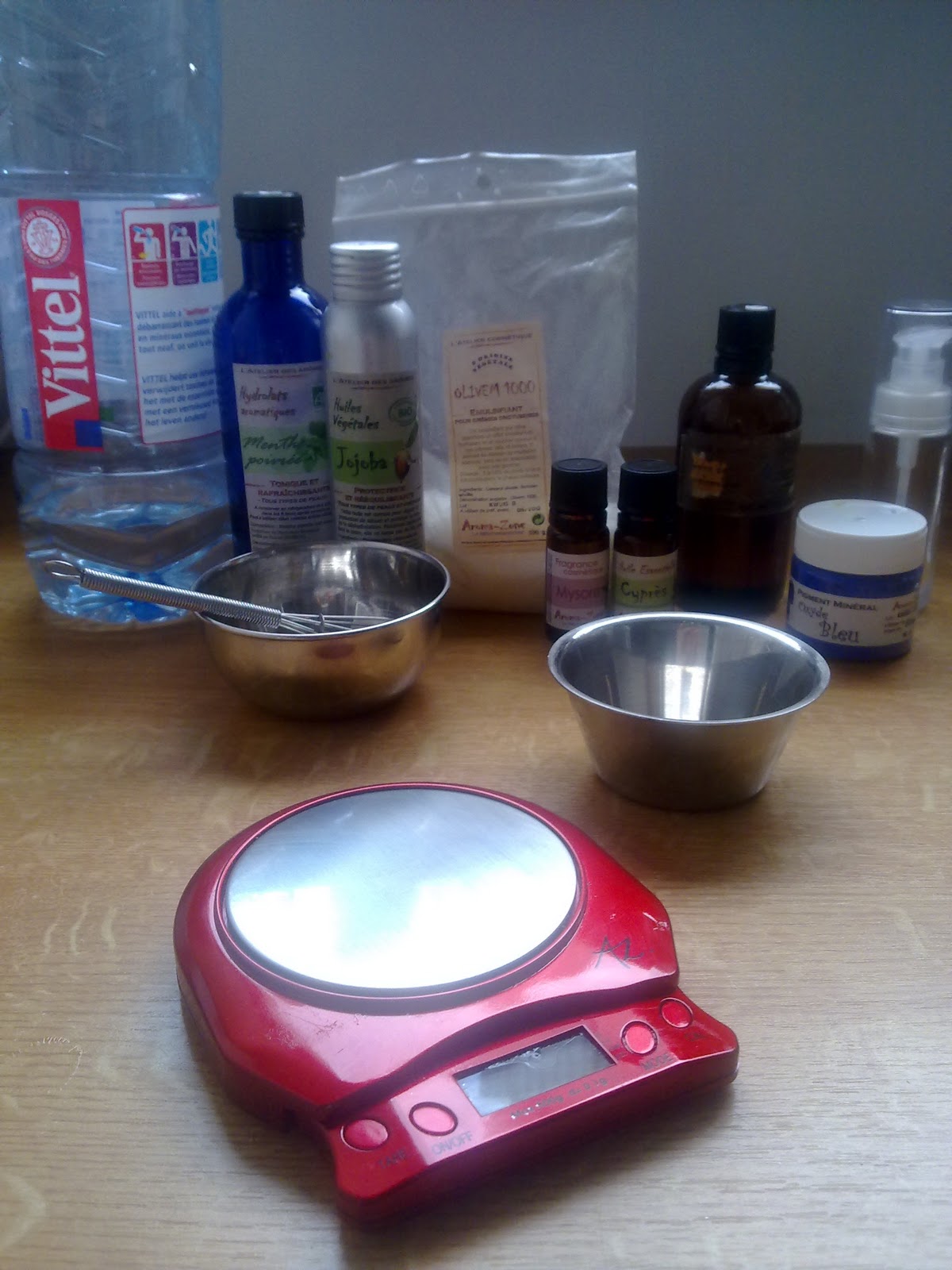 1/ Avant tout, je prépare les ingrédients, et je désinfecte le plan de travail, le matériel, le flacon pour la crème et mes mains :