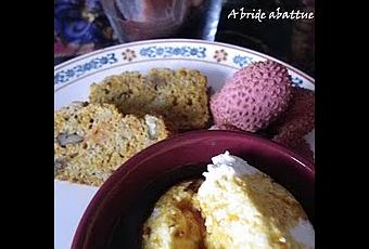 J'avais fait la veille un cake aux carottes (toujours meilleur le lendemain) qui s'est parfaitement accordé bien qu'il soit insuffisamment cuit. Vous me direz qu'il valait mieux qu'il soit moins que trop cuit. Depuis mon déménagement j'ai un vieux four à la porte déglinguée, que je n'osais pas faire fonctionner. J'ai attendu six mois pour faire une première tentative avec une cuisson en papillote, puis je me suis risquée avec ce gâteau. Faudra peut-être à l'avenir que je monte le thermostat ... car manifestement y'a pas que la porte qui soit fatiguée.