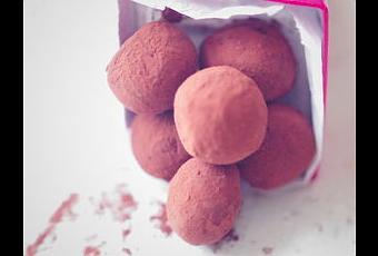 Verser le cacao dans une boîte, prélever à la cuillère à café de la ganache, la rouler entres les mains puis dans le cacao.