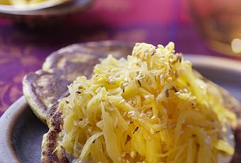 Ouvrir la courge et retirer le cœur avec les pépins. Gratter la chair et l’émietter au besoin. Faire chauffer un trait d’huile dans une grande poêle. Faire revenir les spaghetti à feu vif avec un peu de sel et l’ajowan pendant 2 à 3 minutes.