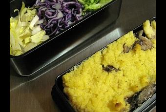 Comme vous le voyez, je reste toujours classique dans mes bentos. Un étage est consacré aux légumes comme ici avec du chou chinois, du chou rouge et de l'endive. Le second étage est à consommer chaud et il s'agit de mon hachi-polenta au chevreuil.